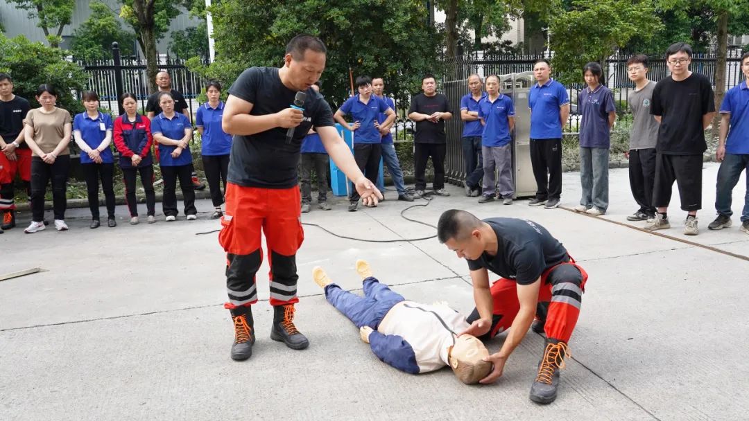 為了應對生產過程中可能發生的觸電、漏電等意外傷害事故,本次消防演練還安排了觸電應急演練,消防教員從截斷電源、脫離電源、心肺復蘇急救三個方面為大家培訓了科學有效的應對方法,實用性強,真正提升了大家對觸電等事故的應急能力。